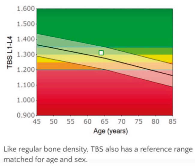 Los valores altos de TBS indican una buena arquitectura, mientras que los niveles más bajos indican degradación trabecular. Los rangos de referencia son: