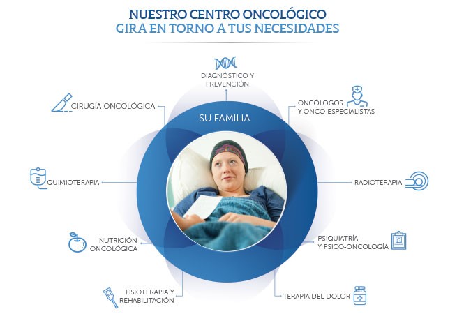 A lo largo del tratamiento cuidamos a cada paciente en todos sus aspectos: médico, psicológico, nutricional, de prevención y control del dolor. Además, tomamos en cuenta a sus familiares, con el fin de desarrollar una red de apoyo humana y cálida que lo acompañe en todo momento.