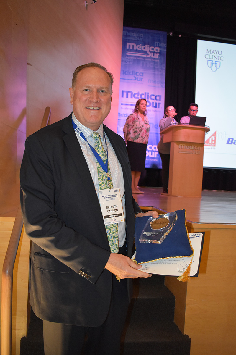 Por último, se entregó un reconocimiento al Dr. Keith J. Cannon, Chair de la división de Medicina Interna de la Clínica Mayo en Phoenix, Arizona; por su trayectoria profesional. El Dr. González Chon fue el encargado de realizar el homenaje. “Médica Sur quiere reconocer al médico pero sobre todo al amigo que ha estado presente en eventos y ocasiones muy significativas para nosotros. Su sonrisa, su calidez y su amistad hacen que le demos las gracias por pertenecer a Médica Sur” expresó.